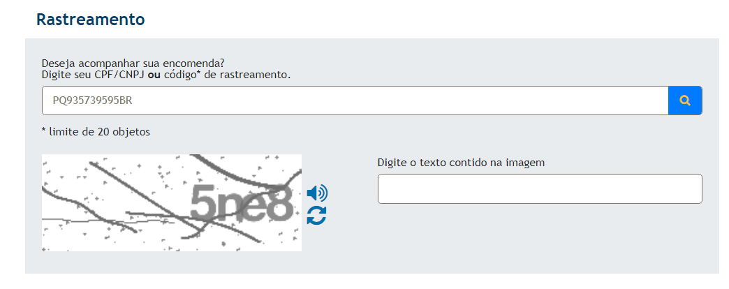 Insira na caixa o código de rastreio que recebeu via e-mail e abaixo insira o texto contido na imagem: